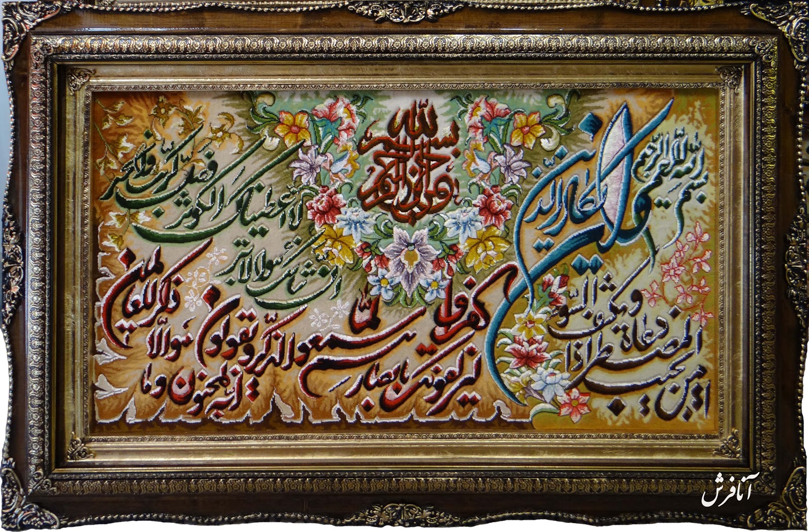 وان یکاد و سوره کوثر، برجسته, ریز تقریبی: 50 رج ، جنس پرز: کرک و ابریشم، جنس چله : نخ،بافت : تبریز ، ابعاد بدون قاب 55*100 سانتی متر