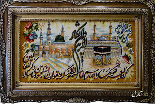 آیه الکرسی و کعبه و مدینه، برجسته, ریز تقریبی: 50 رج ، جنس پرز: کرک و ابریشم، جنس چله : نخ،بافت : تبریز ، ابعاد بدون قاب 70*115 سانتی متر