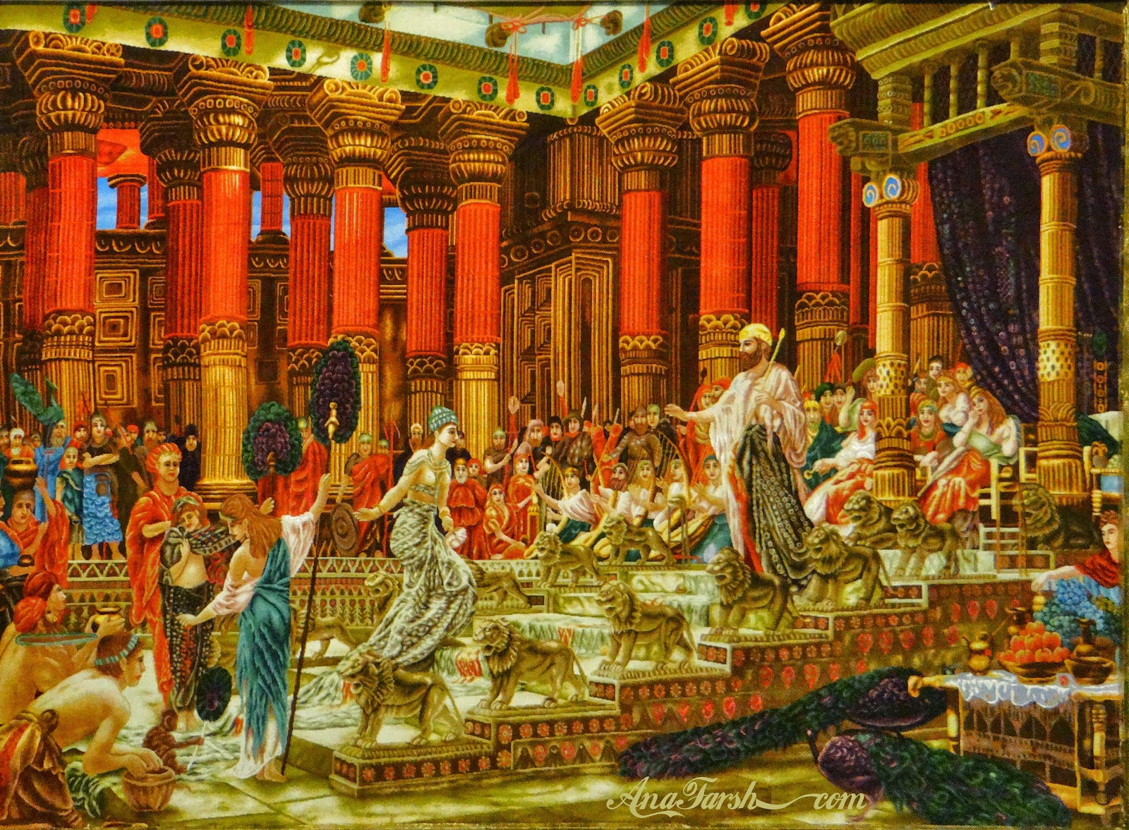 تابلوفرش دستباف کاخ سلیمان , ریز تقریبی: 50 رج , جنس پرز: کرک و ابریشم, جنس چله : ابریشم, ابعاد (بدون قاب): 210*155 سانتی متر , محل بافت: تبریز