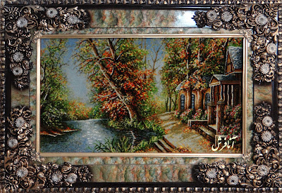 تابلوفرش منظره خانه پدری, ریز تقریبی: 45 رج , جنس پرز: کرک و ابریشم, جنس چله : نخ , ابعاد (بدون قاب):70*41 سانتی متر ,قاب :گلباران, محل بافت: تبریز