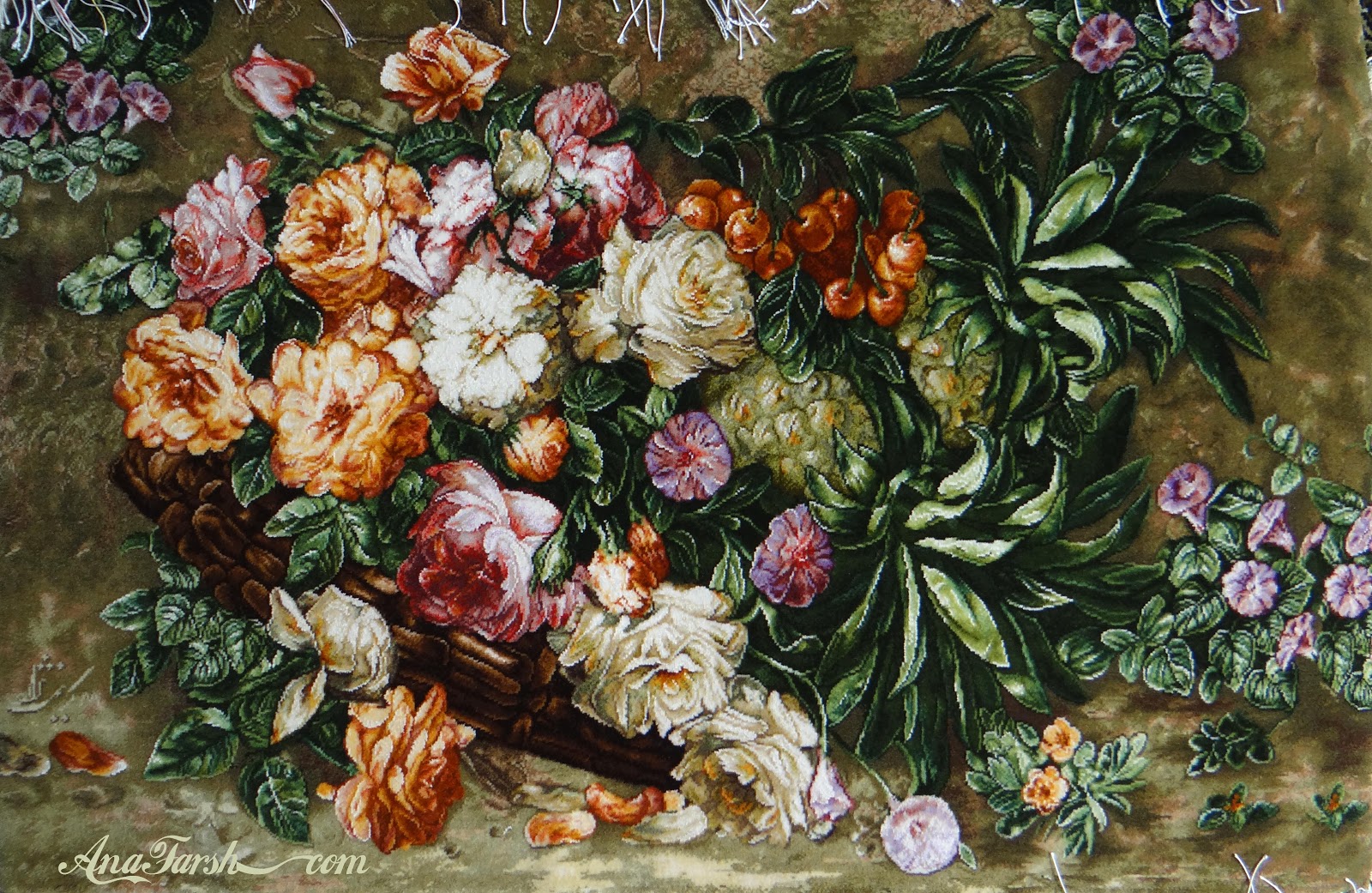 تابلوفرش گل و آناناس , ریز تقریبی: 50 رج , جنس پرز: کرک و ابریشم, جنس چله : ابریشم, ابعاد (بدون قاب): 60 *90 سانتی متر , محل بافت: سردرود - تبریز