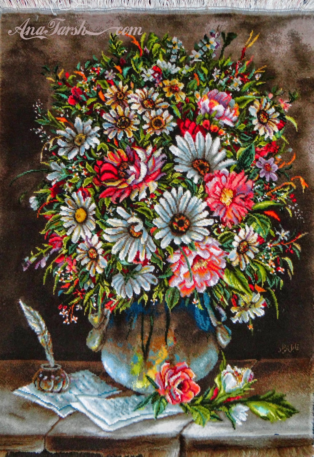 تابلوفرش گل و نامه برجسته, ریز تقریبی: 50 رج , جنس پرز: کرک و ابریشم, جنس چله : ابریشم, ابعاد (بدون قاب): 48*59سانتی متر , محل بافت: تبریز