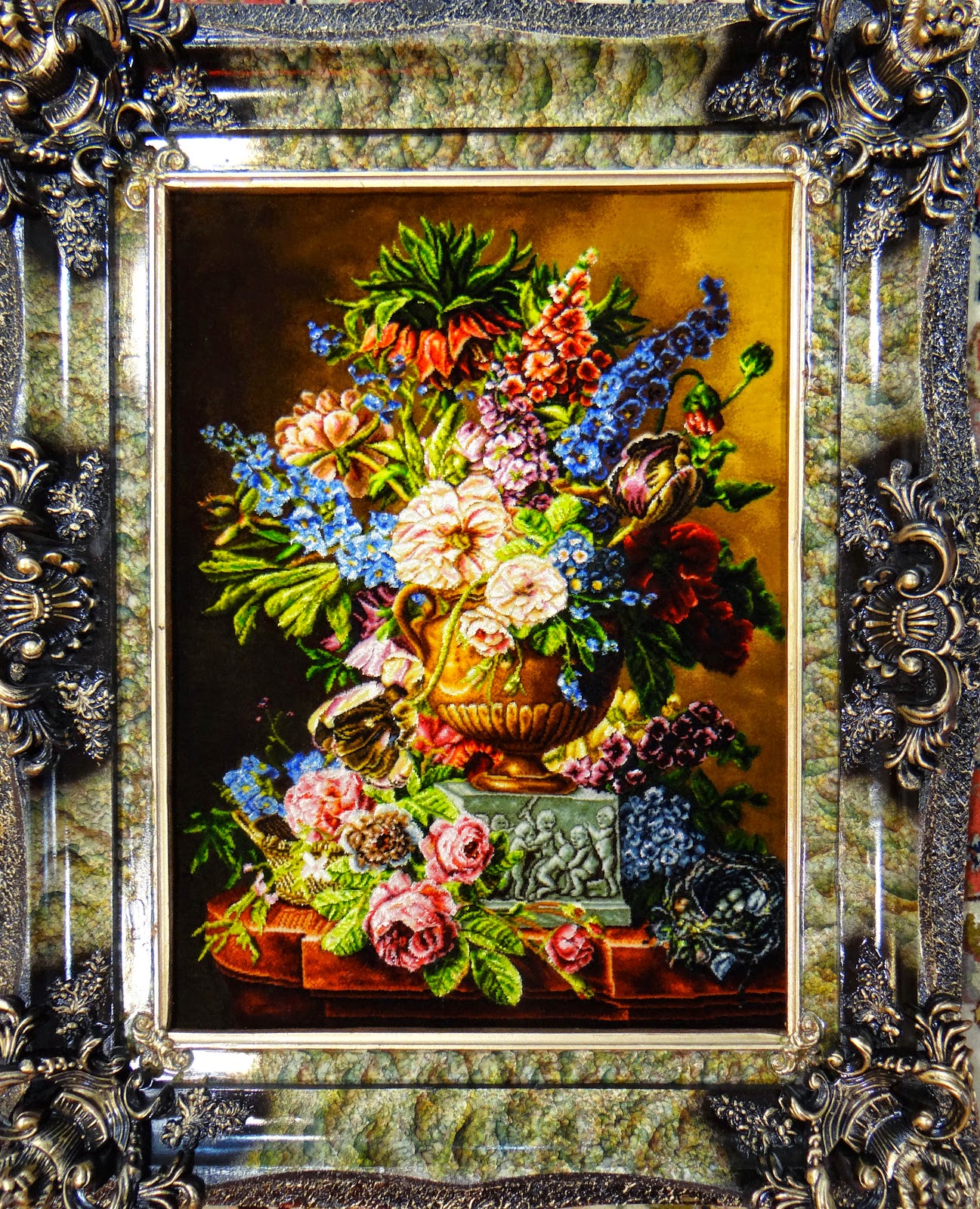تابلوفرش گل و گلدان ، برجسته ، 50 رج ، جنس پرز :کرک و ابریشم، جنس چله : ابریشم ، بافت : تبریز، ابعاد : 50*67سانتی متر
