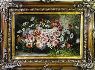 تابلوفرش گل, ریز تقریبی: 50 رج , جنس پرز: کرک و ابریشم, جنس چله : ابریشم , ابعاد (بدون قاب): 60*90 سانتی متر , محل بافت: تبریز- سردرود