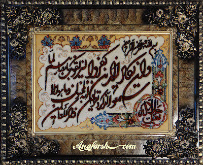 وان یکاد جل جلال کوچک، برجسته, ریز تقریبی: 50 رج ، جنس پرز: کرک و ابریشم، جنس چله : نخ ،بافت : تبریز ، ابعاد بدون قاب 55*40 سانتی متر،قاب گلباران