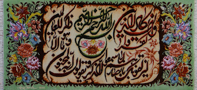 وان یکاد ، برجسته, ریز تقریبی: 50 رج ، جنس پرز: کرک و ابریشم، جنس چله : ابریشم،بافت : تبریز ، ابعاد بدون قاب 70*55 سانتی متر