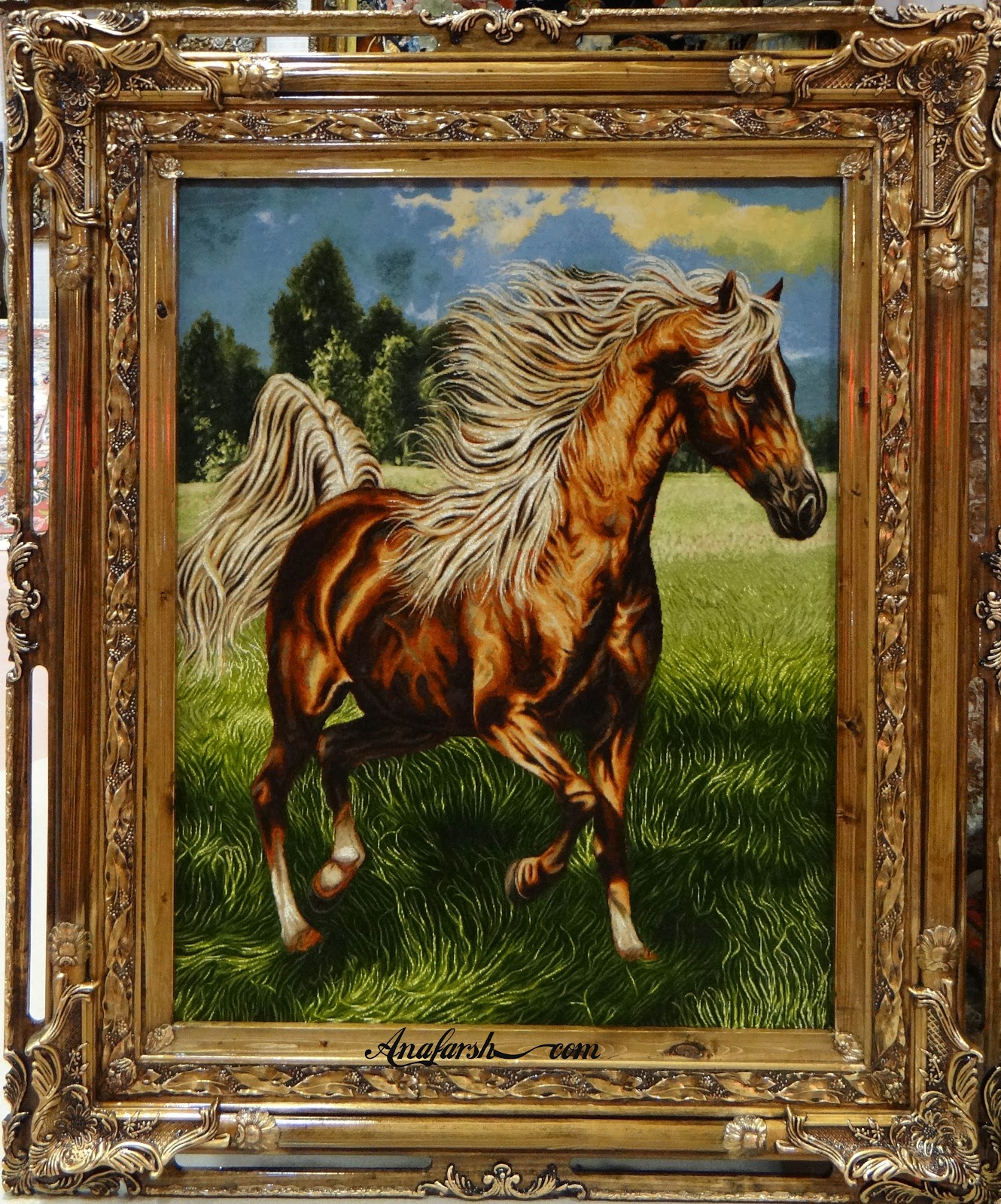 تابلو فرش دختر و اسب، 50 رج ، جنس پرز : کرک و ابریشم، جنس چله :ابریشم، بافت :تبریز، ابعاد(بدون قاب) :60*87