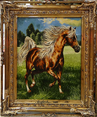 Girl and Horse Tableau Carpets, 50 Knots, Pile: merino & Silk , Warp: silk, Dimensions:87 x60cm - without frame