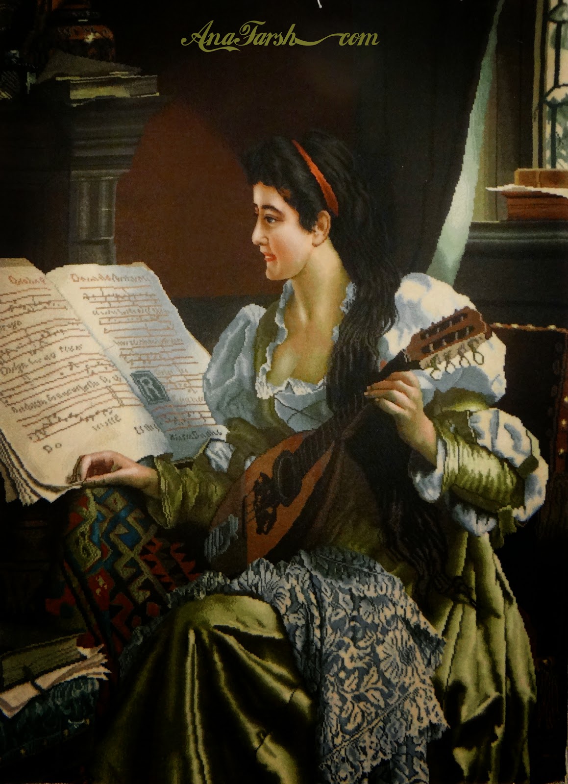 تابلوفرش دستباف دختر تار زن , ریز تقریبی: 50 رج , جنس پرز: کرک و ابریشم, جنس چله : ابریشم, ابعاد (بدون قاب): 60*80 سانتی متر , محل بافت: تبریز