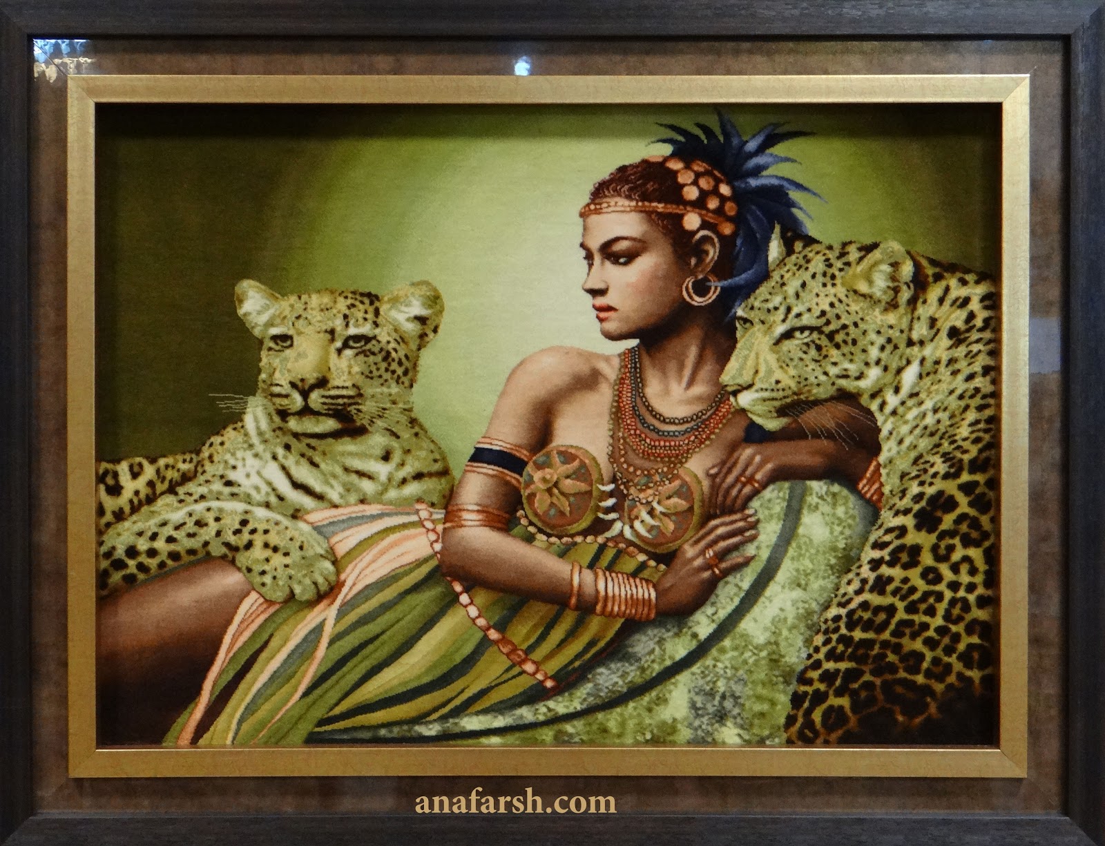 تابلو فرش کلئوپاترا، 50 رج ، جنس پرز : کرک و ابریشم، جنس چله :ابریشم، بافت :تبریز،ابعاد(بدون قاب) :75105*
