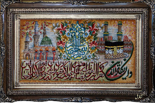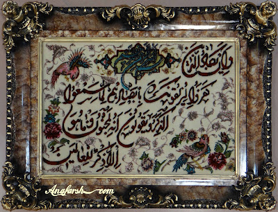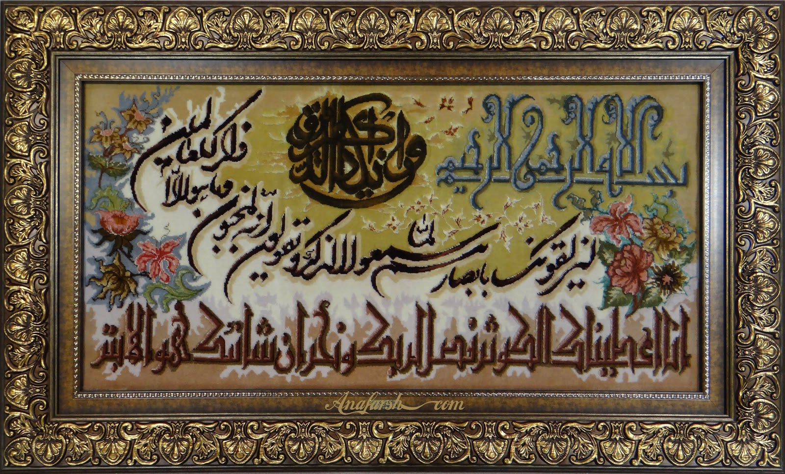 تابلو فرش وان یکاد و سوره کوثر ,ریز تقریبی : 50 رج ، جنس پرز: کرک و ابریشم، جنس چله : نخ ،بافت : تبریز ، ابعاد بدون قاب 50* 100 , قاب پی وی سی