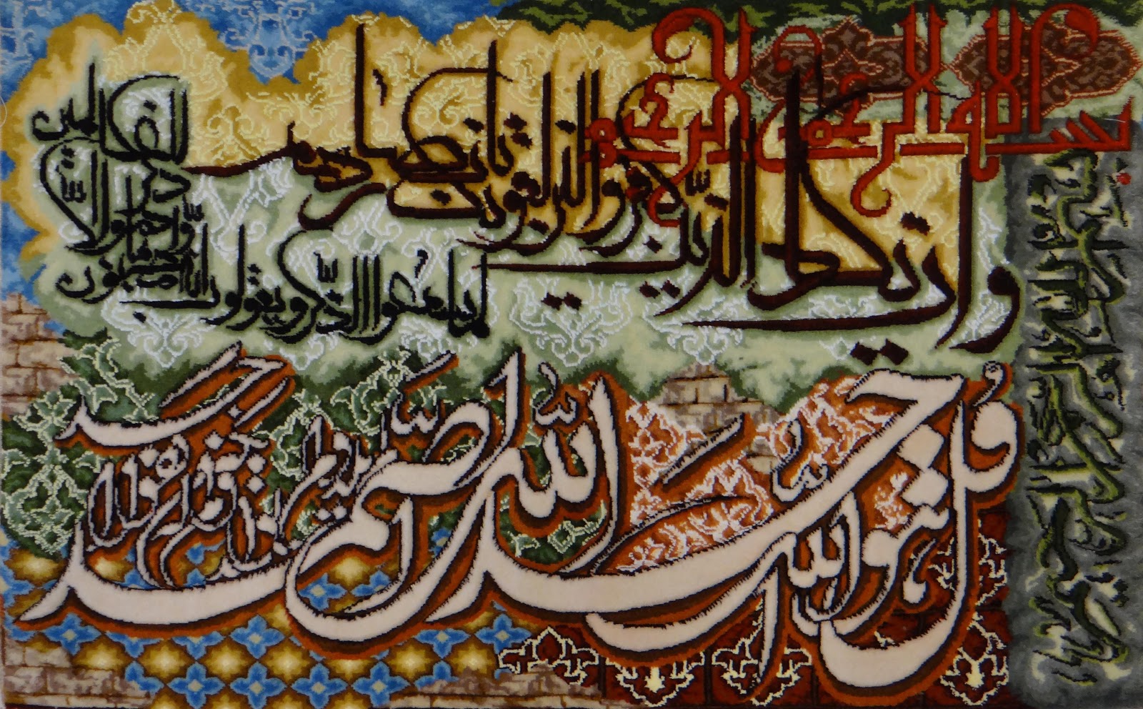 تابلو فرش دست باف اسماء الله ، وان یکاد و آیه الکرسی برجسته، 50 رج ، جنس چله:نخ، جنس پرز : مرینوس و ابریشم ، ابعاد 100*70 سانتی متر