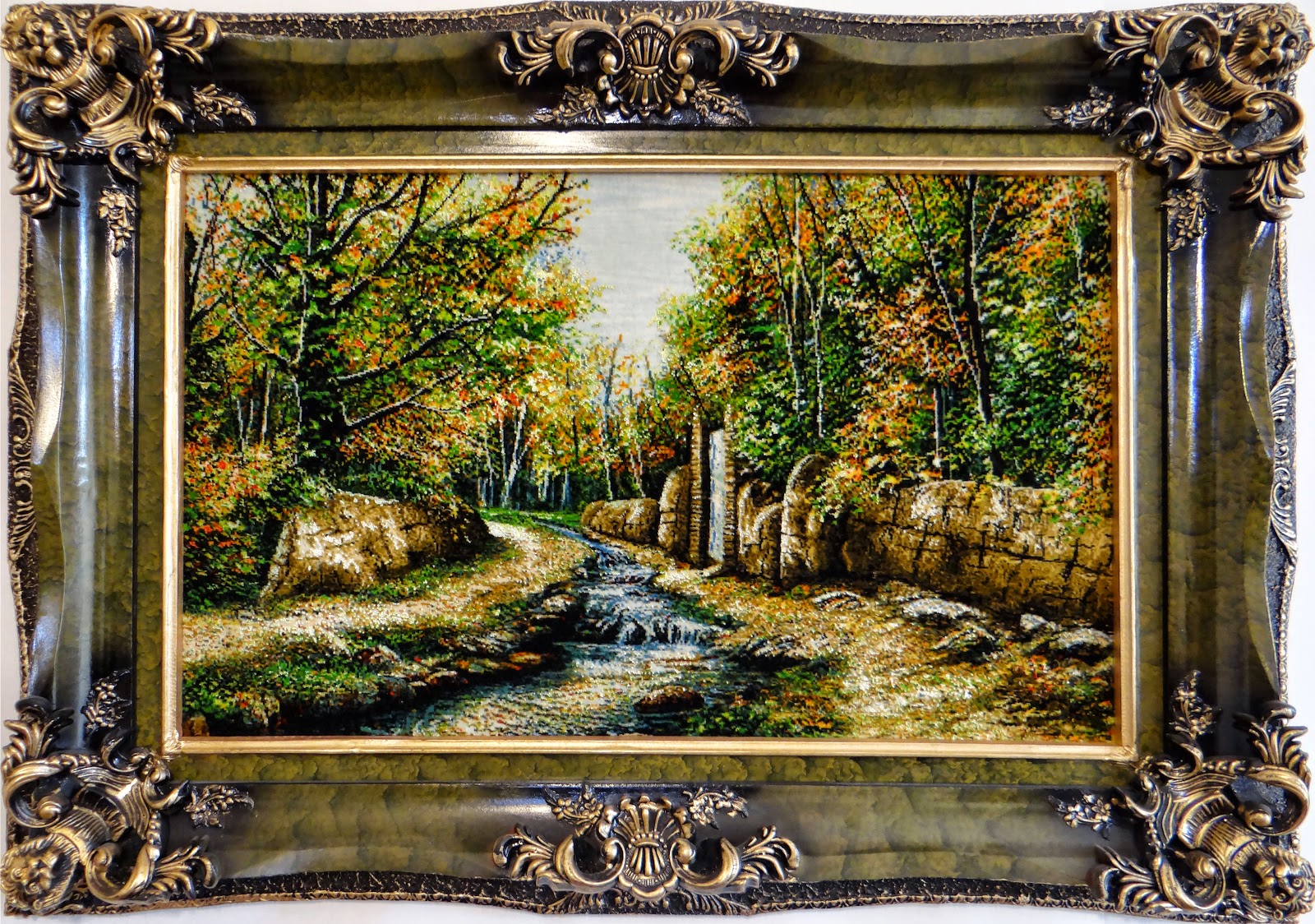 تابلو فرش کوچه باغ ، 40 رج ، جنس پرز : کرک و ابریشم، جنس چله :نخ، بافت :تبریز،ابعاد(بدون قاب) : 42*78 سانتی متر