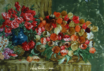 تابلوفرش سبد گل برجسته آیناز , ریز تقریبی: 50 رج , جنس پرز: کرک و ابریشم, جنس چله : ابریشم, ابعاد (بدون قاب): 70*50 سانتی متر , محل بافت: تبریز