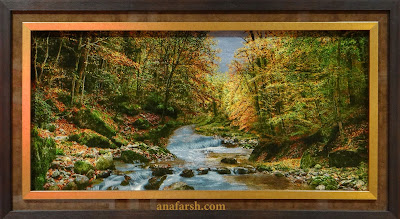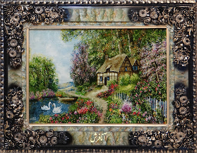 تابلوفرش منظره کلبه , ریز تقریبی: 50 رج , جنس پرز: کرک و ابریشم, جنس چله : ابریشم, ابعاد (بدون قاب):60*90 سانتی متر , محل بافت: تبریز
