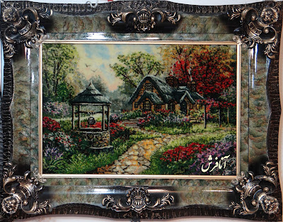تابلوفرش منظره کلبه , ریز تقریبی: 50 رج , جنس پرز: کرک و ابریشم, جنس چله : ابریشم, ابعاد (بدون قاب):60*90 سانتی متر , محل بافت: تبریز