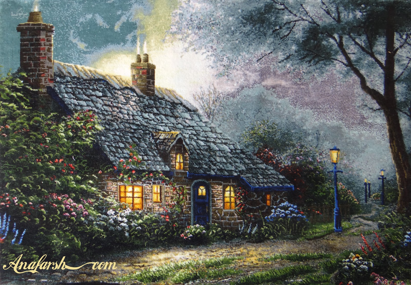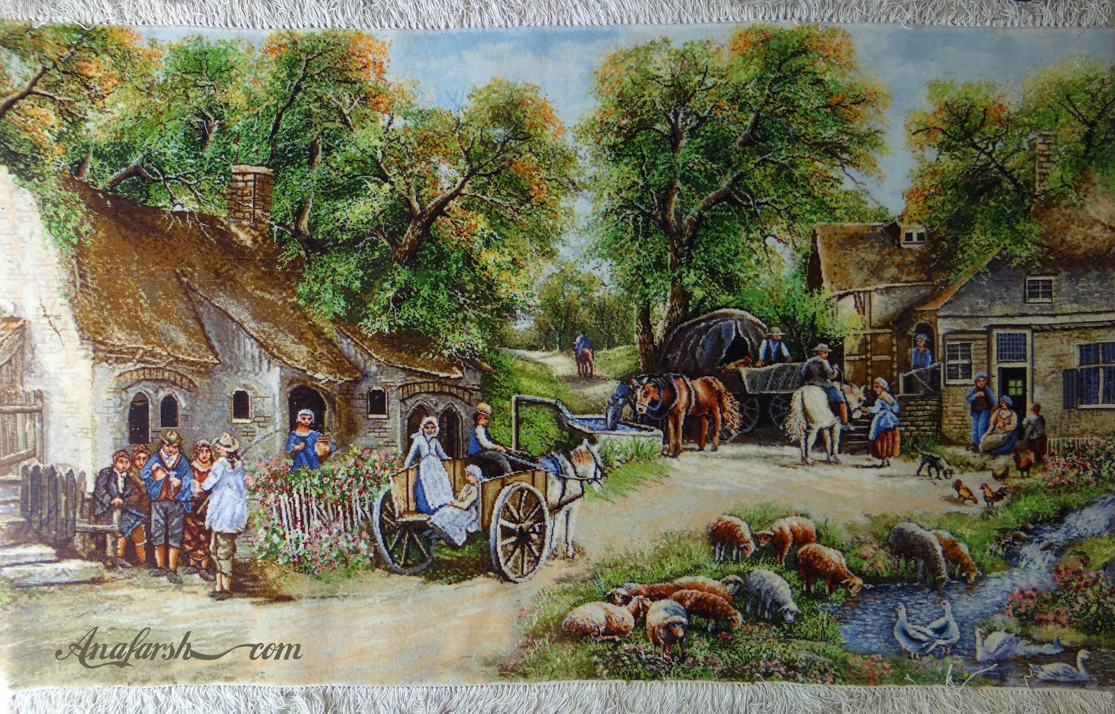 تابلوفرش منظره کلبه , ریز تقریبی: 50 رج , جنس پرز: کرک و ابریشم, جنس چله : نخ , ابعاد (بدون قاب):60*40 سانتی متر ,قاب :گلباران, محل بافت: تبریز
