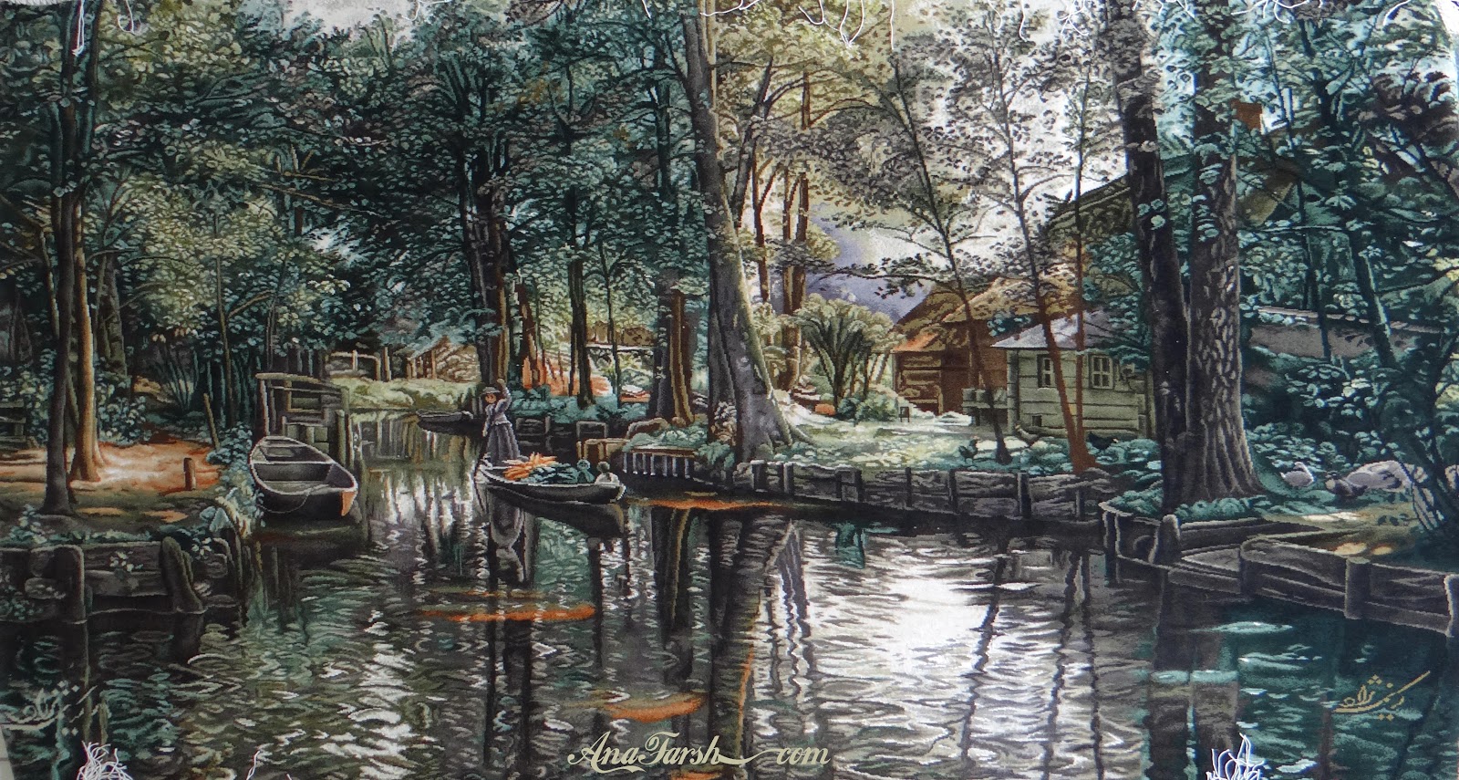 Tableau view cottage and stone bridge , 50 Knots, Pile: Silk&merino, Warp: Silk, dimensions 75 *47 cm,Texture: Tabriz