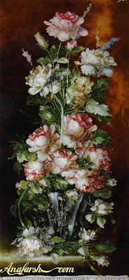تابلوفرش گل لاله , ریز تقریبی: 50 رج , جنس پرز: کرک و ابریشم, جنس چله : ابریشم , ابعاد (بدون قاب): 78 *55 سانتی متر , محل بافت: تبریز- سردرود