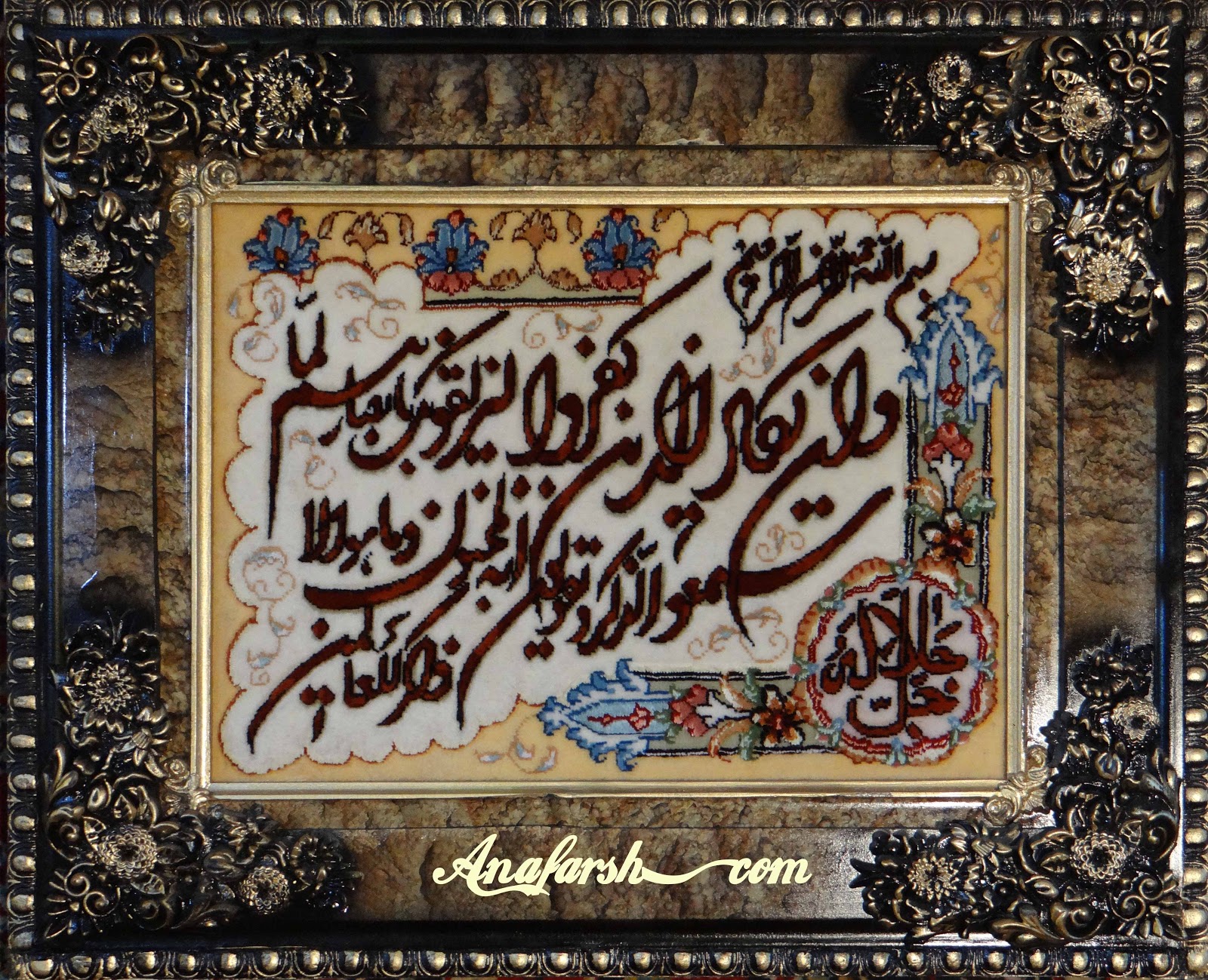 وان یکاد جل جلال ، برجسته, ریز تقریبی: 45 رج ، جنس پرز: کرک و ابریشم، جنس چله : نخ ،بافت : تبریز ، ابعاد بدون قاب 60*40 سانتی متر