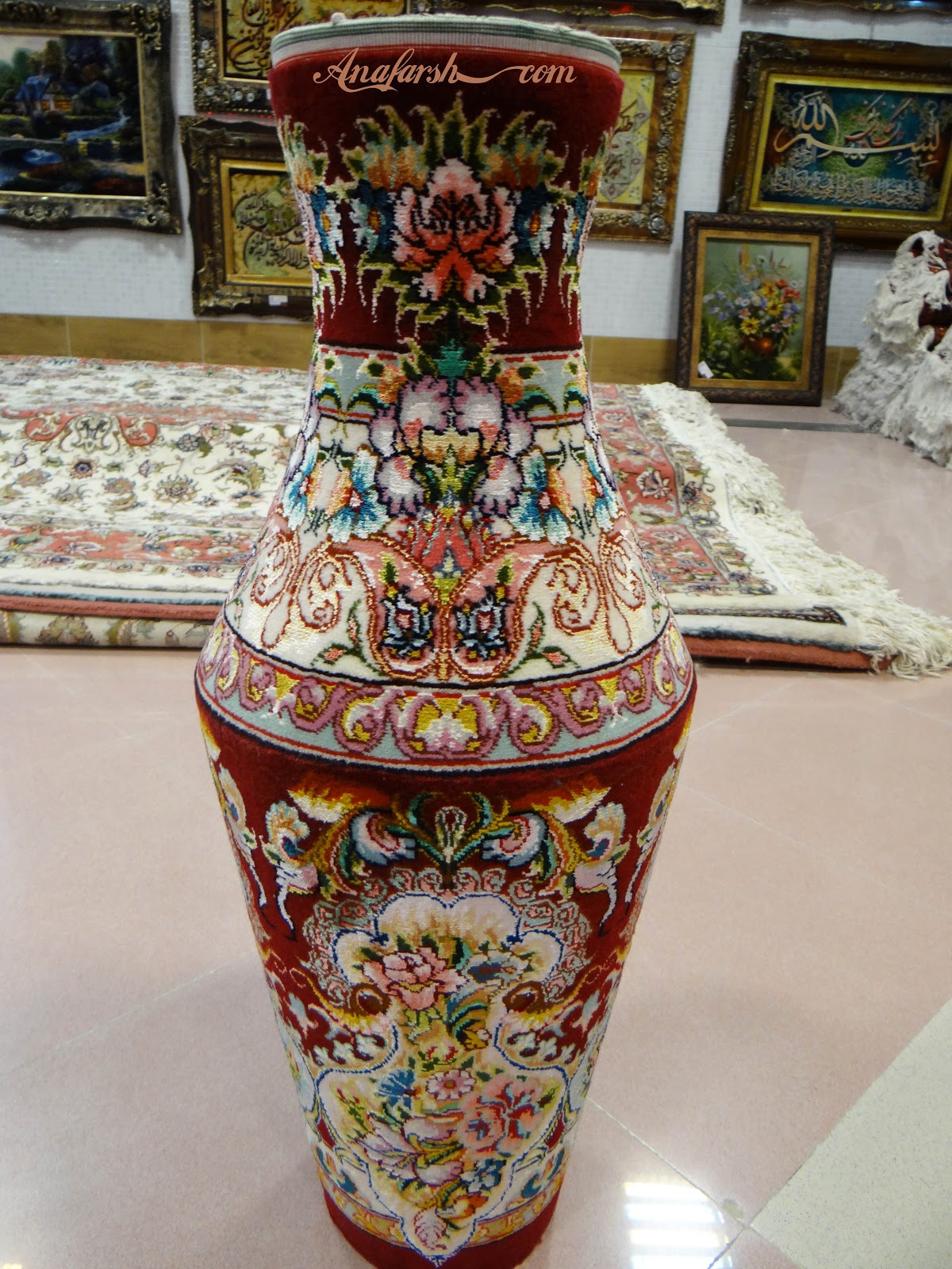 گلدان کوزه ای ابریشمی، 50رج، جنس پرز: کرک و ابریشم، جنس چله :نخ، بافت:تبریز، ارتفاع 84 سانتی متر، قطر بزرگ 30 سانتی متر، قطر کف: 15 سانتی متر